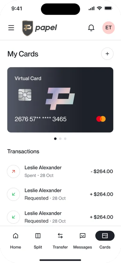 Choose between a virtual or physical card and enjoy fast, secure, and flexible spending with Papel.