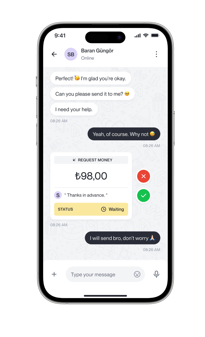 Send and receive money directly within your chat conversations. No need to switch apps, transfer funds while chatting, making it easier to settle debts or send gifts.
